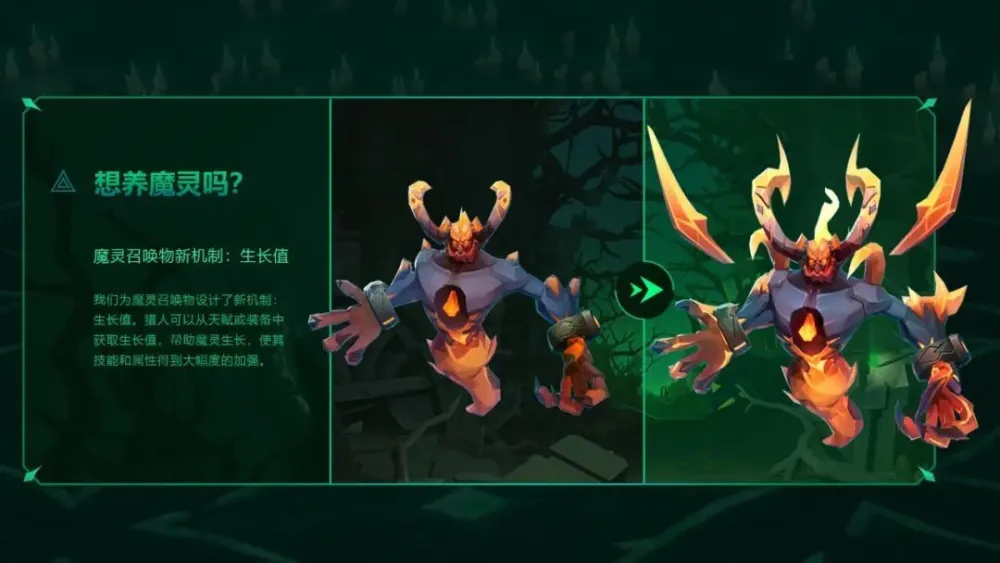 生长值是魔灵天生拥有的一种资源值。积累一定的生长值,魔灵便会生长1阶,最高可达5阶。猎人可以从天赋或是装备中获得生长值,帮助魔灵生长,使其各项属性得到全面加强,技能得到质的飞跃。
