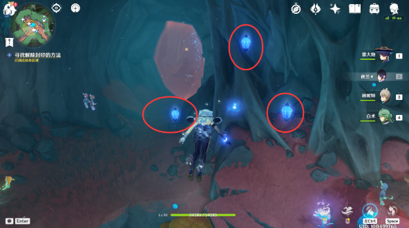 4、然后要寻找解除封印的方法,只要使用普攻键瞄准攻击接触三个机关即可;