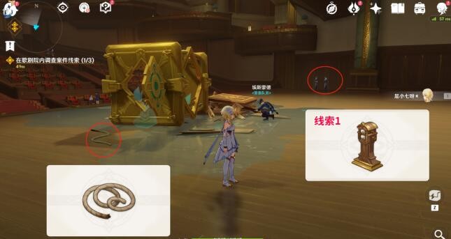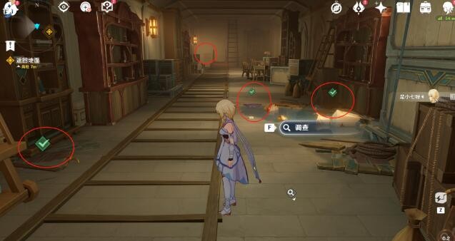 6、使用道具在这里调查三个线索,位置如图。