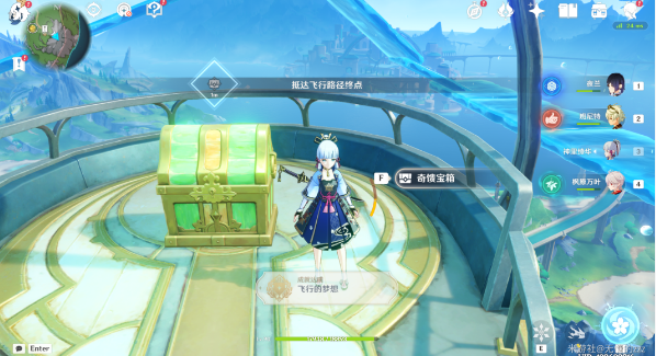 3、完成之后可以获得成就【飞行的梦想】,以及奇馈宝箱,天上还会有【天上的水神瞳一枚】。