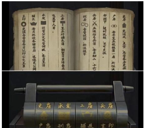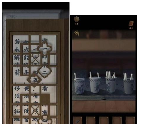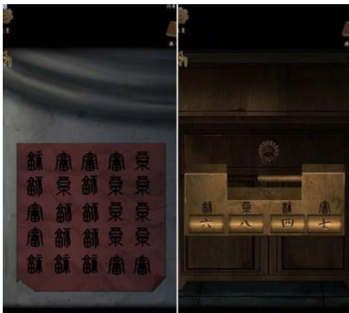 13、屏风后面结合挂字信息摆放桌前字画筒数量打开窗户得到抽屉拉环,安装在左边书柜抽屉上拉开得到印章,蓖麻油和朱砂粉倒入书桌上砚台,用印章得到蘸了印泥的印章,盖在字上得到铜钥匙,打开右边暗室。