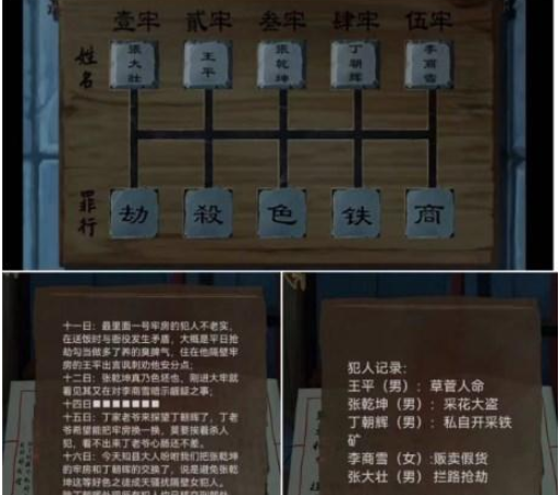 6、打开桌上上锁的盒子得到犯人名牌和犯人记录,桌上得到干抹布,牢房门口摆放牌子得到锋利小刀。